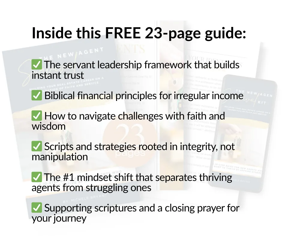 Transform your real estate career with biblical principles that actually work. This comprehensive 10-step guide shows new agents how to build lasting success through servant leadership, authentic relationships, and unwavering integrity. Stop chasing transactions and start stewarding dreams - while building the income you deserve.
